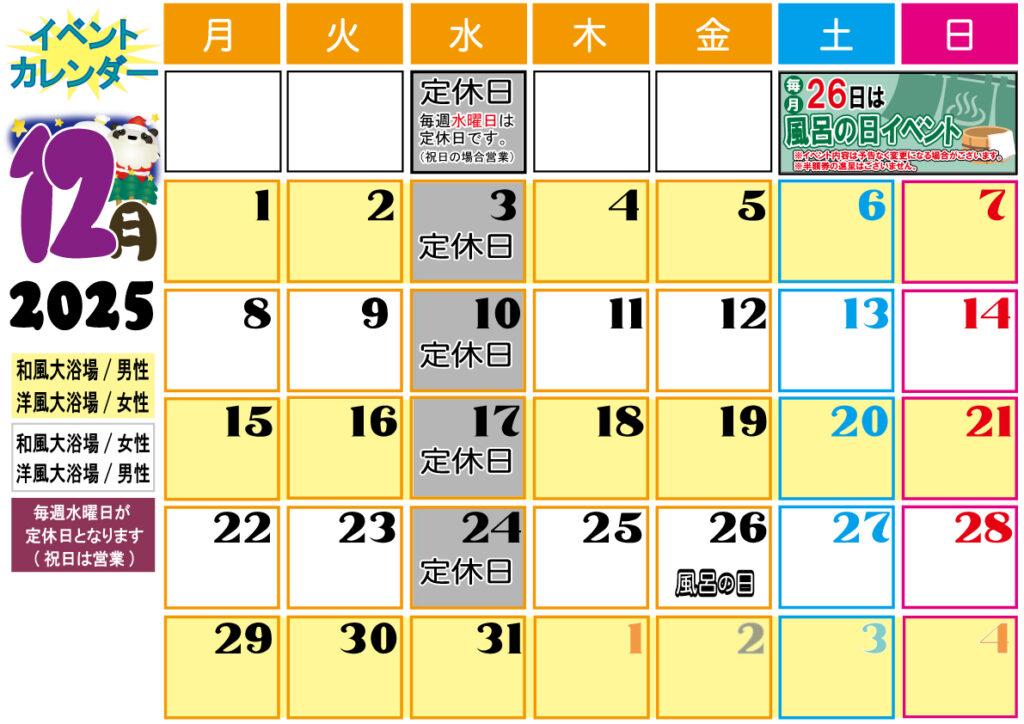 今週(12/1~12/7)の大浴場は、男性【和風】、女性【洋風】になります。