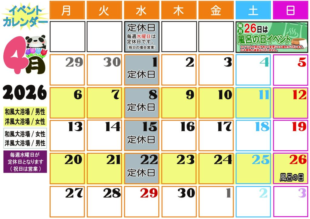 今週(3/30~4/5)の大浴場は、男性【洋風】、女性【和風】になります。